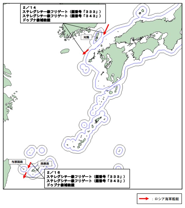2月14日午前0時頃、海上自衛隊は対馬(長崎県)の北東約90kmの海域において、南西進するロシア海軍の艦艇3隻を確認した。内訳は、ステレグシチー級フリゲート2隻(艦番号「333」および「343」)と、ドゥブナ級補給艦1隻である。