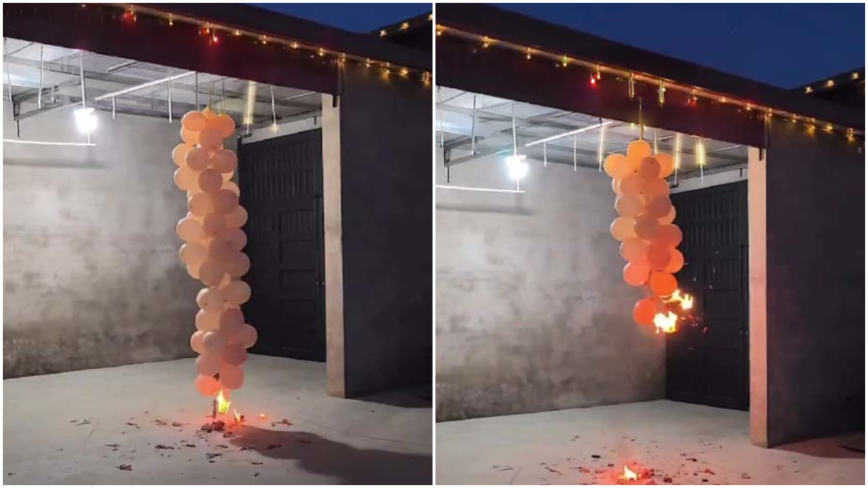 河北省で爆竹の代わりに風船に火をつける市民。2026年旧正月 (ネット動画より)