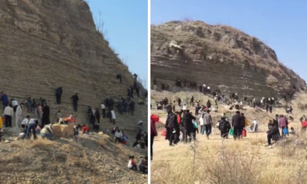 山東省泰安市東平県の琴山。SNSに「化石が掘れる」とする動画が投稿されると、一気に拡散。遠方から車で数時間かけて訪れる人もいるという。