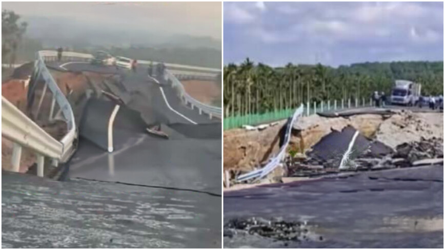 中国・海南省瓊海市(けいかい-し)で2月11日、建設中の幹線道路の一部が突然崩れた。道路はまだ完成しておらず、一般車両は一度も通行していない。