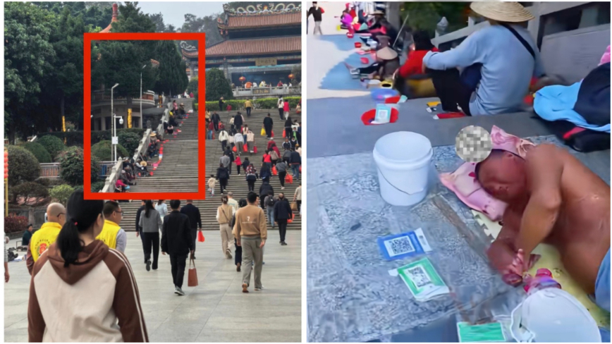 中国南部・広東省の沿海都市、汕頭市にある地元の人々が願掛けに訪れる参拝地で、異様な光景が広がっている。石段の両脇に、物乞いの人たちがずらりと並んでいるのだ。