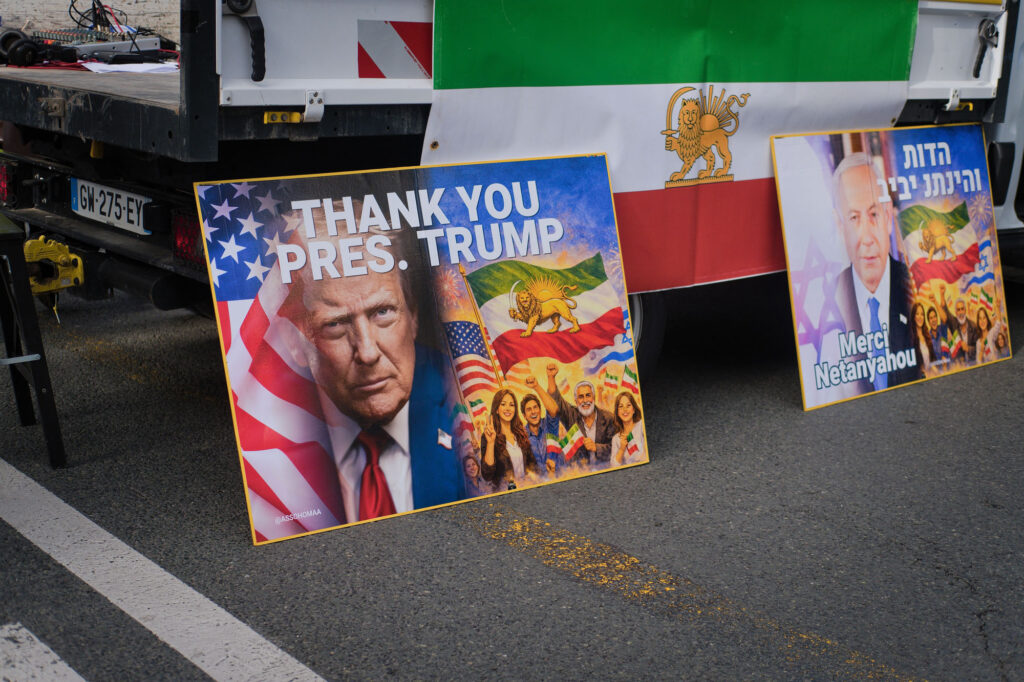 2026年3月7日、フランス・パリで行われたイランの政治変革を支持する集会で、参加者は米国のトランプ大統領とイスラエルのネタニヤフ首相に感謝を示す標語を掲げた。(Djoudi Hamani/Hans Lucas/AFP via Getty Images)​
