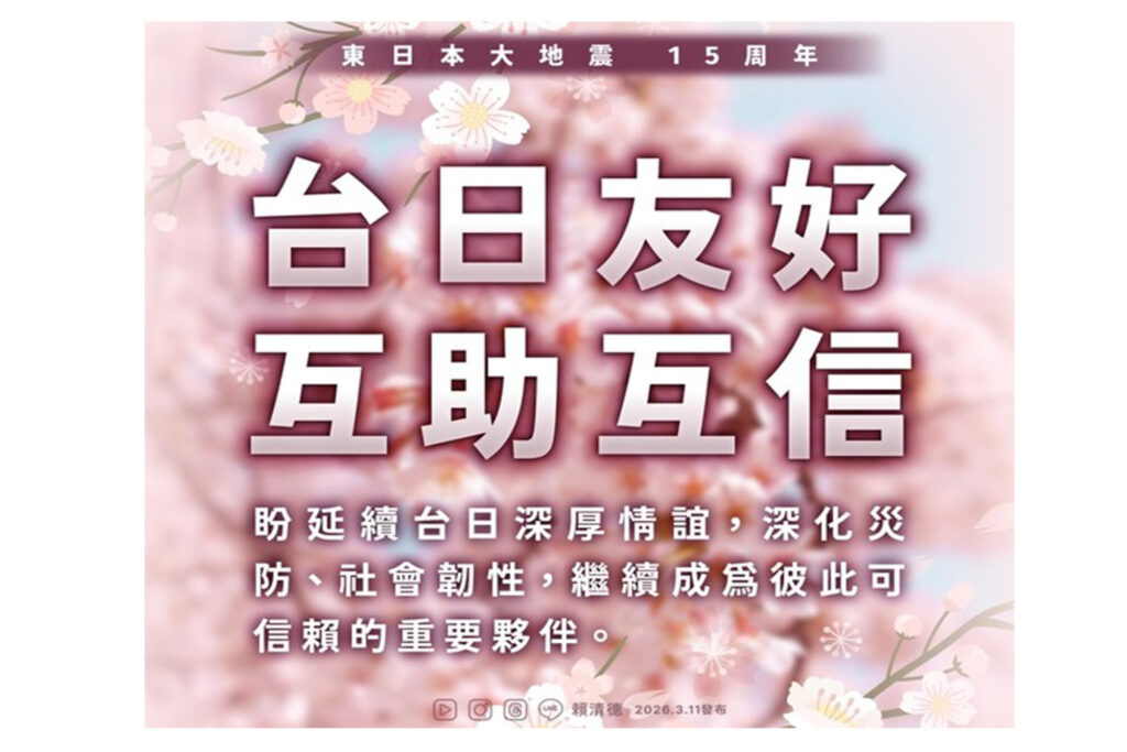 中華民国の賴清徳総統は3月11日、東日本大震災から15年を迎え、台湾と日本はいずれも地震帯に位置し、深い歴史的なつながりと固い民間の友情を有していると述べた。そのうえで、「今後、こうした基盤の上に立ち、防災・人道支援・社会の強靭性など、実質的な協力をさらに深めていきたい」との考えを示した。
