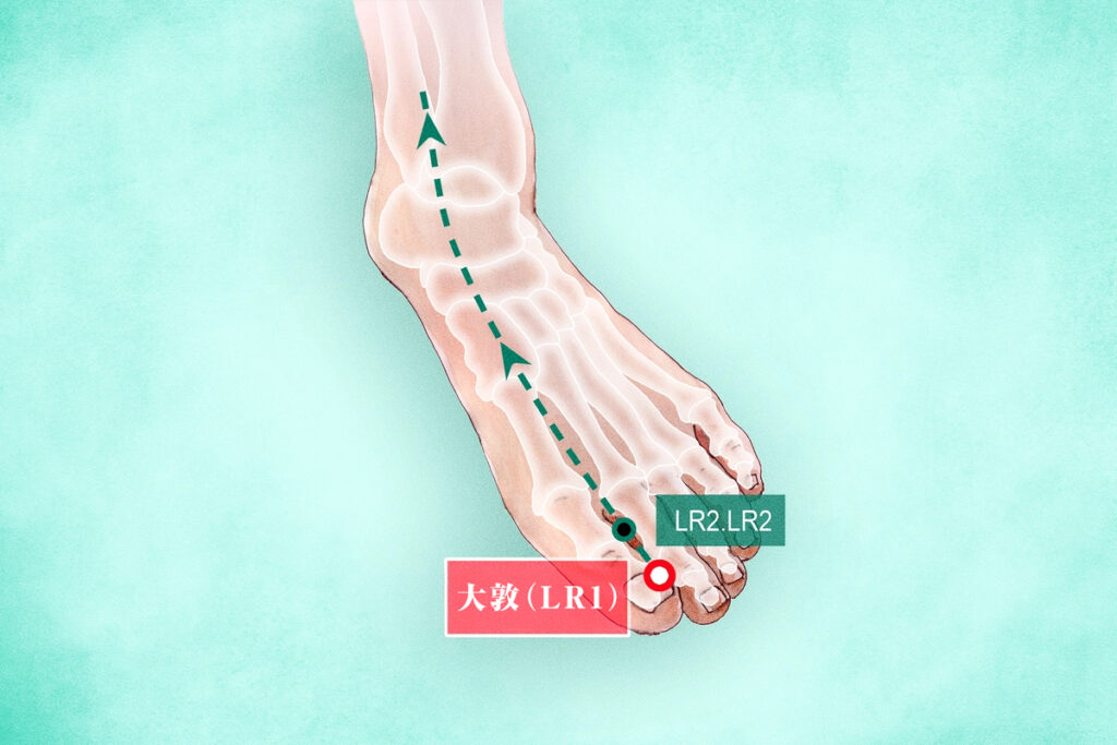 「大敦」は足の厥陰肝経(けついんかんけい)の最初のツボであり、中医学では気(生命エネルギー)と血のスムーズな流れを司る重要なエネルギー経路です。西洋医学では肝臓を主に解毒器官と捉えるのに対し、中医学では肝臓を体の「将軍」と捉え、「大敦」は気の流れを司る役割を担っています。