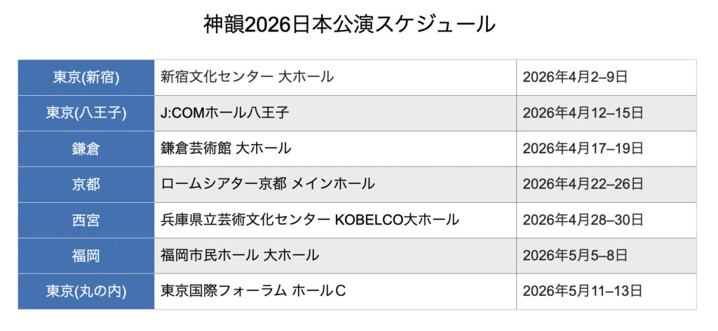 2006年にニューヨークで設立された神韻芸術団は今では8つの同規模の芸術団を擁し、世界中で同時に巡回公演を行なっている。昨年度のワールドツアーでは24か国の200近い都市で巡回公演を行い、数々の世界トップレベルの劇場で満員の大盛況を記録した。