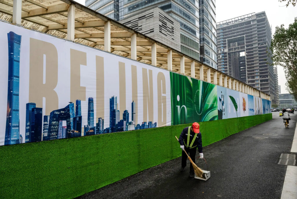 2024年10月18日、北京の中央ビジネス地区で、「北京」と書かれた看板の横の道路を清掃する作業員。北京は2026年の国内総生産(GDP)成長率目標を4.5~5%に設定したが、これは1991年以来の最低水準となる(Kevin Frayer/Getty Images)