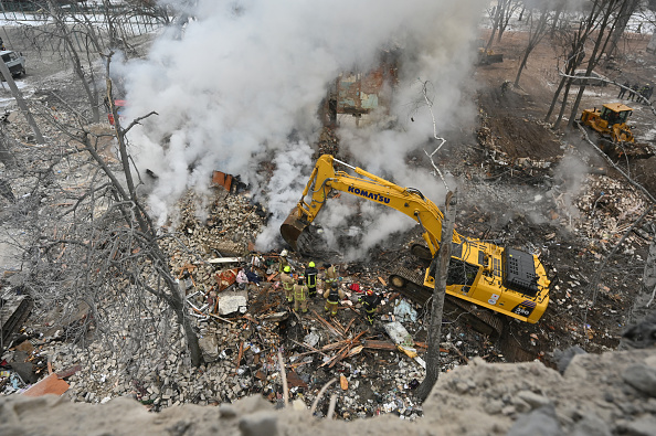 2026年3月7日、ロシアによるウクライナ侵攻の最中、ハリコフにある5階建ての住宅ビルが弾道ミサイルの攻撃を受けた。救助隊員が瓦礫の中を捜索した (Photo by SERGEY BOBOK / AFP via Getty Images)