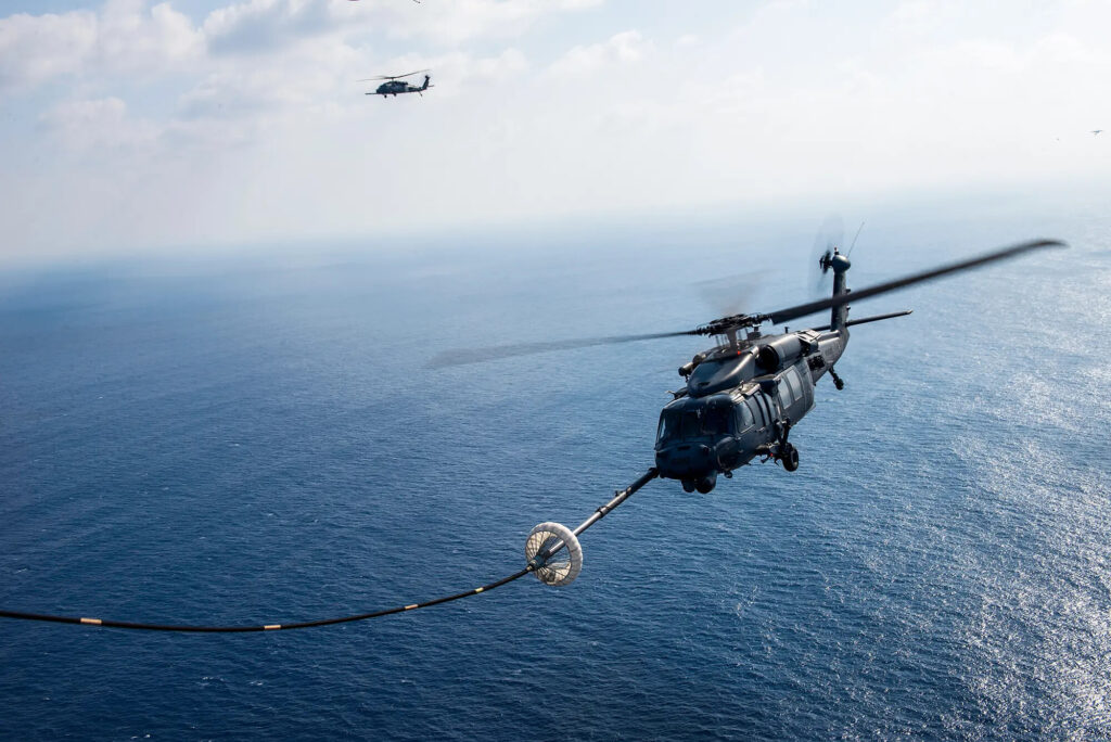 2016年11月7日、日本の沖縄近海で行われた演習中、HH-60ペイブホークがMC-130Jから空中給油を受けている。米中央軍は、救助任務のために人員、装備、ヘリコプター部品を輸送する目的で、2機のMC-130Jを編成した(Senior Airman Stephen G. Eigel/U.S. Air Force)