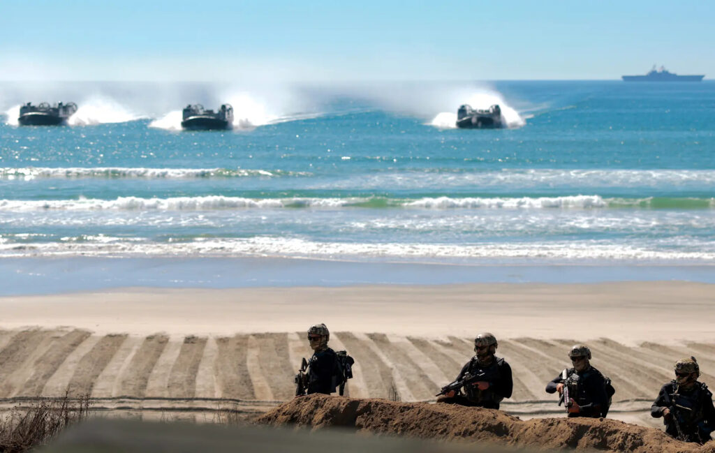 2025年10月18日、カリフォルニア州オーシャンサイドのキャンプ・ペンドルトンで開催された「アメリカ海兵隊創設250周年」イベントで、米海軍特殊部隊SEALsのチームが上陸用エアクッション艇の接近を受け、海岸に陣地を構えている(Mario Tama/Getty Images)