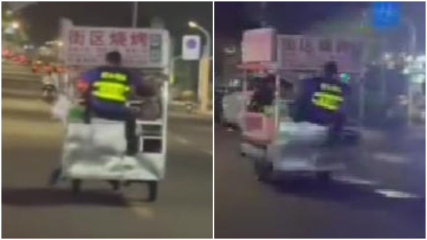 夜の通りにエンジン音が響く。取り締まりから逃げようと、屋台の三輪車が突然加速し車道へ飛び出した。これを止めようとした城管が後部に飛びつき、鉄のフレームに必死にしがみつくが、体の半分は外に投げ出されたままだ。
