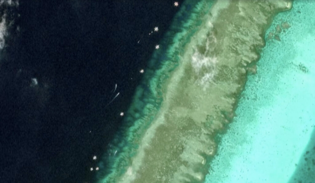 衛星画像プロバイダーのVantorは、大型巡視船が浅瀬の入口外側に停泊しており、警戒任務を担っているとみられると述べた。