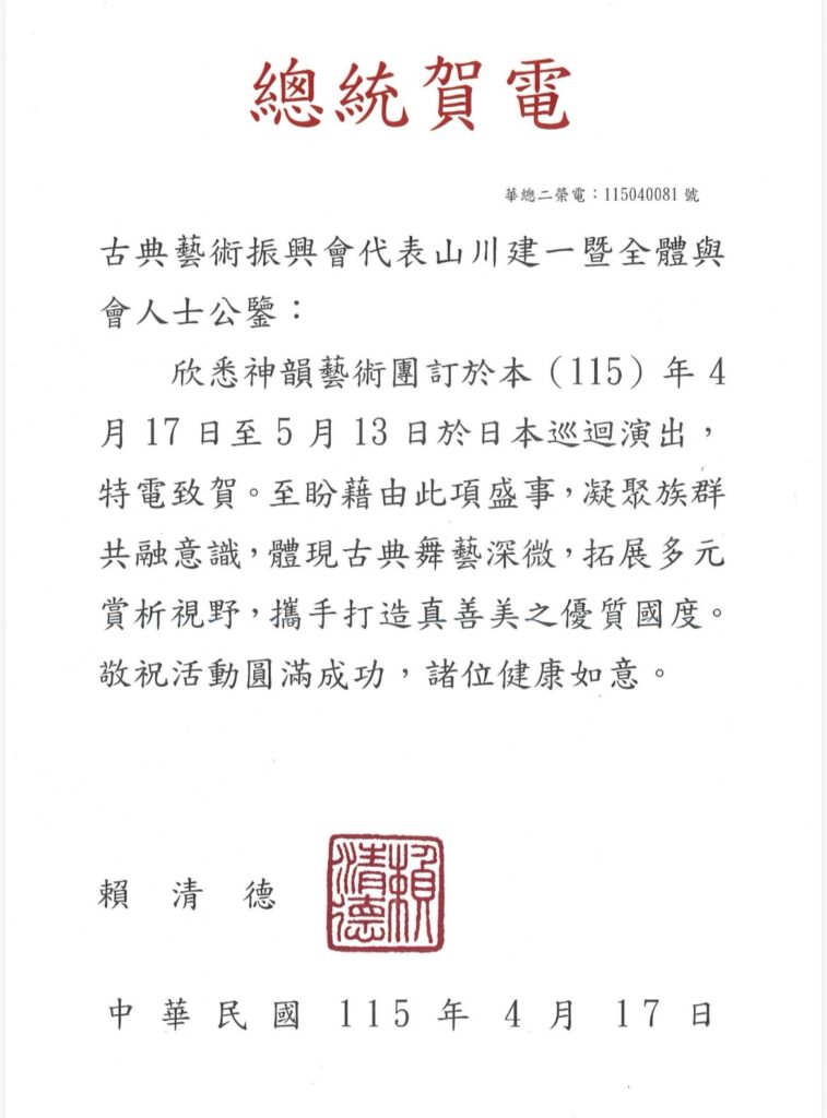 頼総統は今回の祝電の中で、同芸術団が4月17日から5月13日にかけて日本での巡回公演を開催することを喜ばしく思い、特別な祝意を表している。