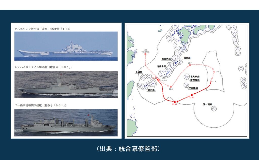 中国共産党海軍の空母「遼寧」を中心とする艦隊が太平洋上で活動し、艦載機の発着艦訓練を集中的に実施した。防衛省は自衛隊艦艇や哨戒機を投入し、継続的な警戒監視と情報収集を行っている